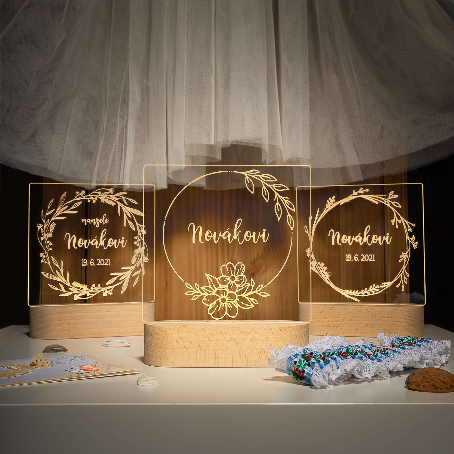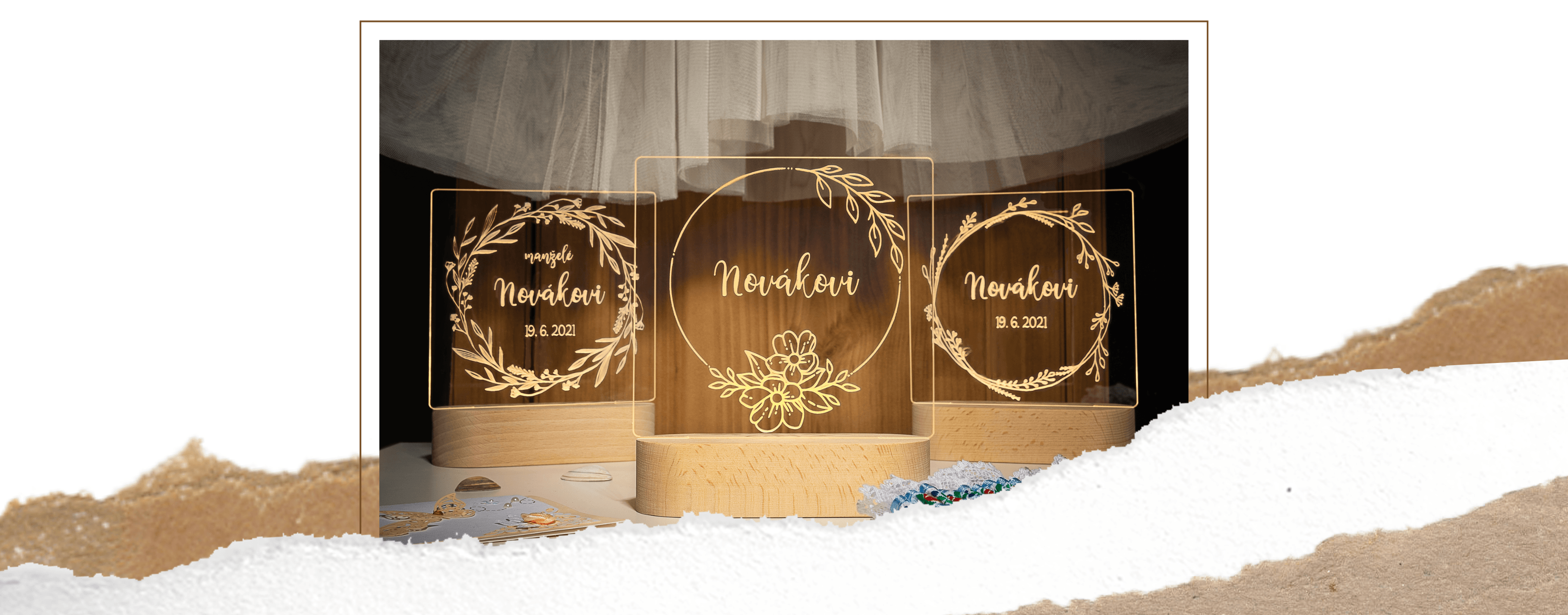Hledáte dar na svatbu nebo k výročí? Jste na správném místě. Na lampu si můžete nechat vyrobit jména manželů či datum svatby. Na výběr máte ze tří motivů, do kterých můžete vepsat cokoliv Vás napadne