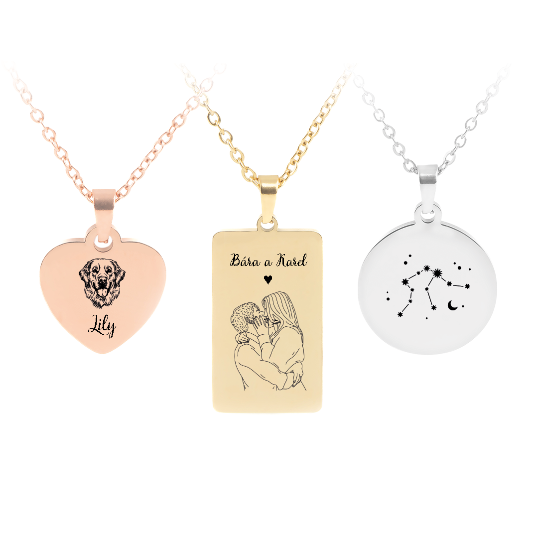 Nechte si vyrobit něco výjimečného. Do náhrdelníku Vám vygravírujeme vašeho mazlíčka, fotku, znamení zvěrokruhu nebo cokoli, co Vás napadne! Vybrat si můžete ze tří různých tvarů a barev.