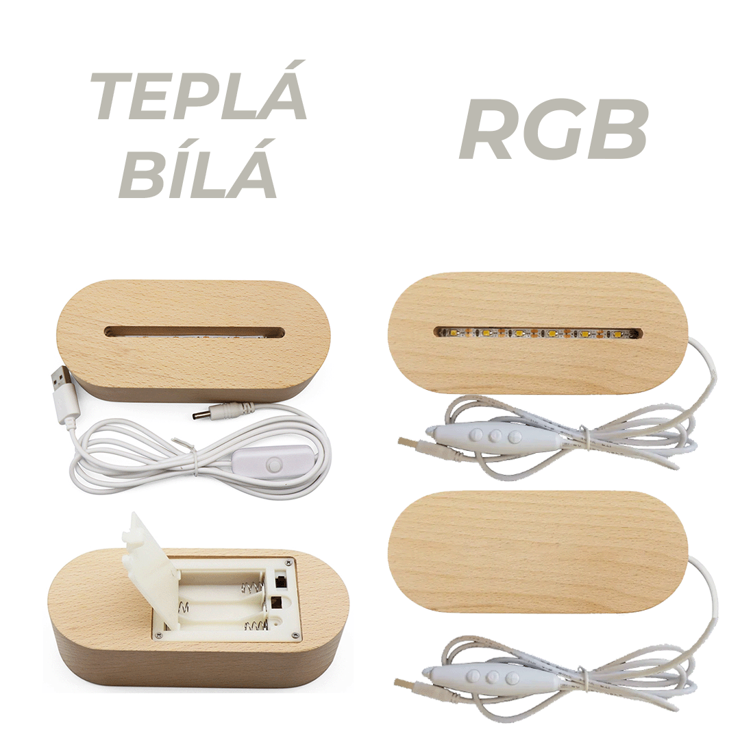Používáme kvalitní dřevěné podstavce, které v jednobarevné variantě mohou být napájeny na AAA baterie i na USB kabel, který je součástí balení.